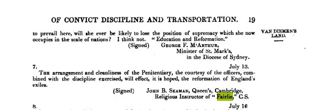 The barque Fairlie, 775 tons, two guns, was a convict transport built in Calcutta. The ship departed Plymouth on March 11, 1852 with 45 crew and arrived at Hobart, Van Diemen's Land (Tasmania) on July 3, 1852. On board were 292 male convicts and 30 pensioner guards with families. There were 24 women and 47 children also on board. In charge of the convict guard was Ensign Meagher for the 99th Regiment. Surgeon Edwarth Nolloth RN voyaged in the Cabin as did the religious instructor John B. Seaman and his wife.