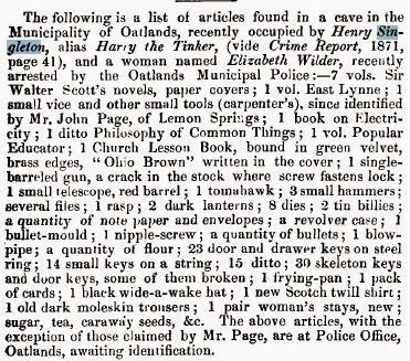 The following is a list of articles found in a cave in the Municipality of Oatlands, recently occupied by Henry Singleton, alias Harry the Tinker (vide Crime Report, 1871, page 41), and a woman named Elizabeth Wilder, recently arrested by the Oatlands Municipal Police: - 7 vols Sir Walter Scott's novels, paper covers; 1 vol. East Lynne; 1 small vice and other small tools (carpenter's), since identified by Mr John Page, of Lemon Springs; 1 book on Electricity; 1 ditto Philosophy of Common Things; 1 vol. Popular Educator; 1 Church Lesson Book, bound in green velvet, brass edges, "Ohio Brown" written in the cover; 1 single-barreled gun, a crack in the stock where screw fastens lock; 1 small telescope, red barrel; 1 tomahawk; 3 small hammers; several files; 1 rasp; 2 dark lanterns; 8 dies; 2 tin billies; a quantity of note paper and envelopes; a revolver case; 1 bullet mould; 1 nipple-screw; a quantity of bullets; 1 blow-pipe; a quantity of flour; 23 door and drawer keys on steel ring; 14 small keys on a string; 15 ditto; 30 skeleton keys and door keys, some of them broken; 1 frying-pan; 1 pack of cards; 1 black wide-a-wake hat; 1 new Scotch twill shirt; 1 old dark moleskin trousers; 1 pair woman's stays, new; sugar, tea, caraway seeds &. The above articles with the exception of those claimed by Mr Page, are at Police Office, Oatlands, awaiting identification.Henry Singleton's impressive stash of loot was discovered in a cave at Oatlands after his arrest, reported on 6 June 1873. He was held at the Oatlands Gaol in the Men -on-Routes room until taken on Page's coach to the Hobart Gaol. He was photographed soon after arrival by Thomas J. Nevin, the photograph (above, left) now held at the National Library of Australia. He may have been sent to the Port Arthur prison again but his name IS NOT on the lists of those 109 men who were sent there from the Hobart Gaol, and then relocated back to the Hobart Gaol by July 1873 at the request of the Parliament.